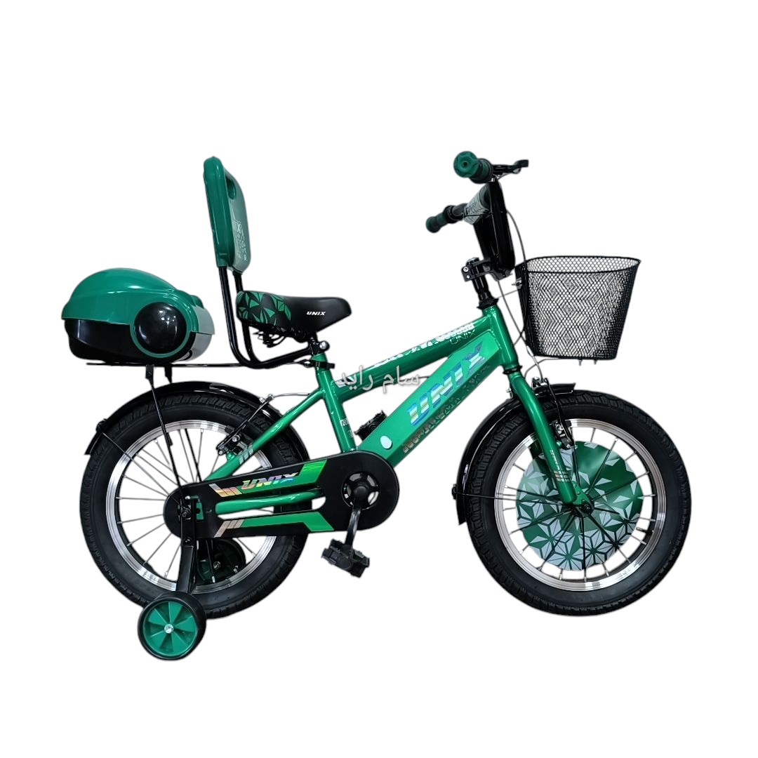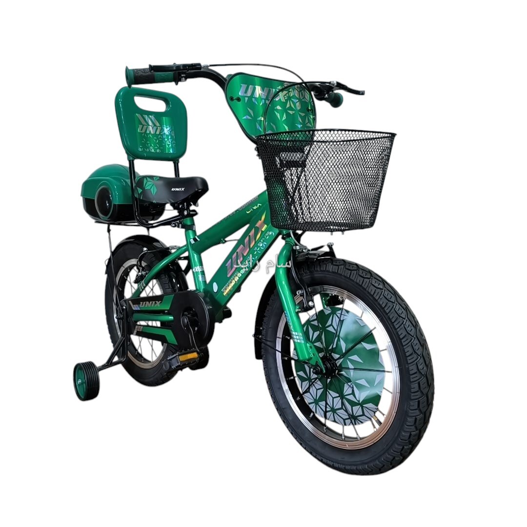 دوچرخه سایز ۱۶ سبز سبد پشتی دار لاستیک پهن UNIX