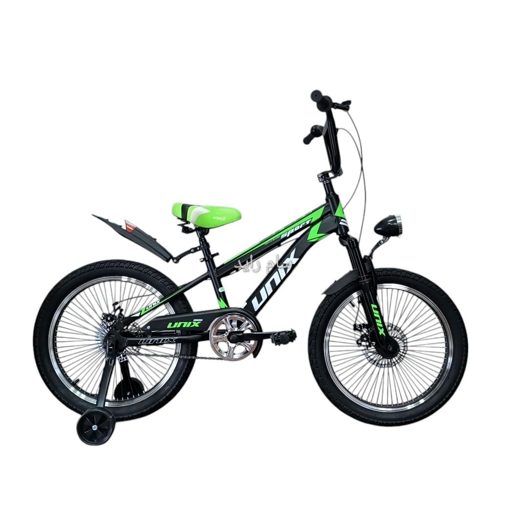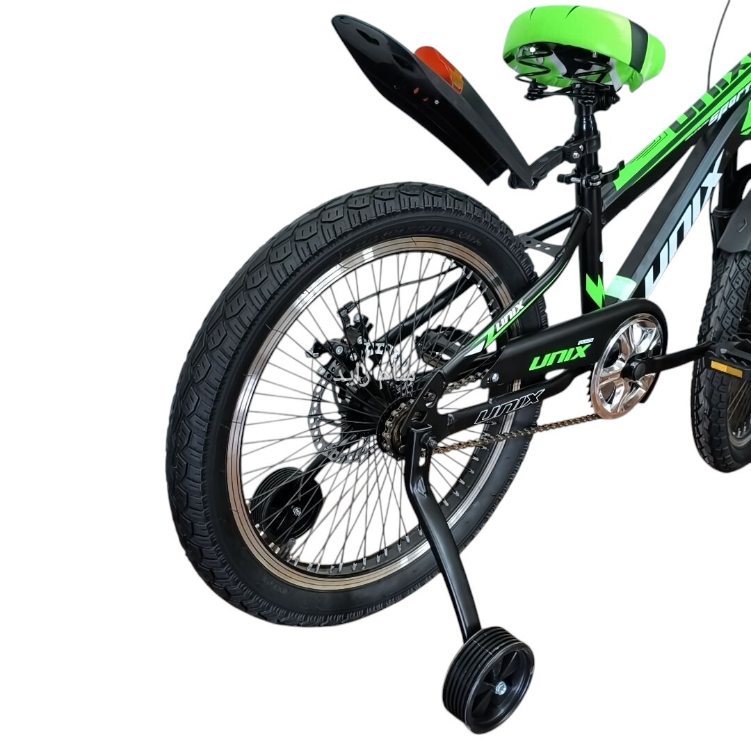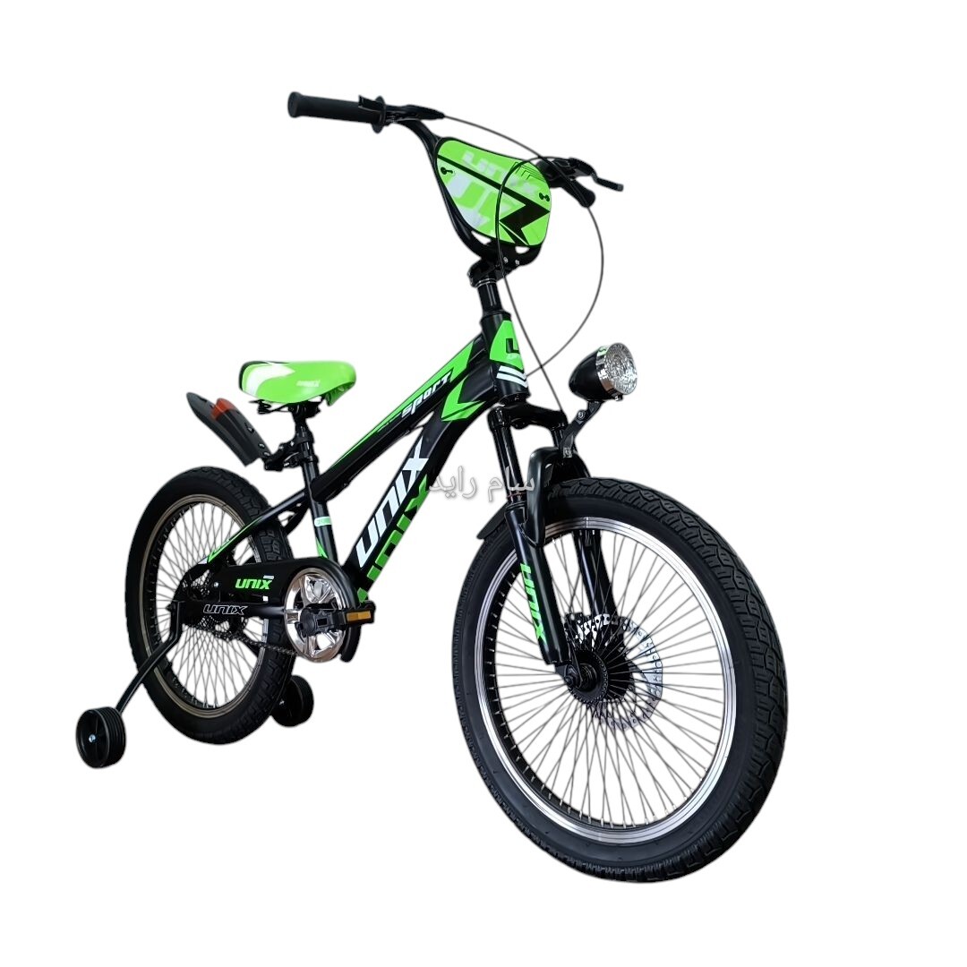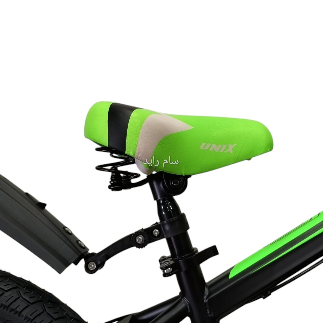 دوچرخه سایز ۲۰ سبز مشکی درجه۱ چراغ و کمکفنر دار لاستیک پهن UNIX