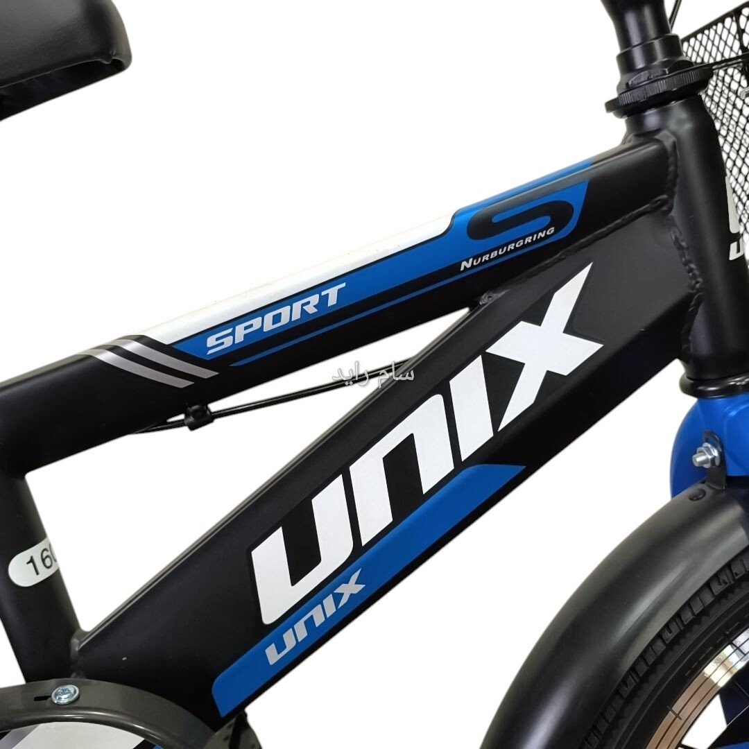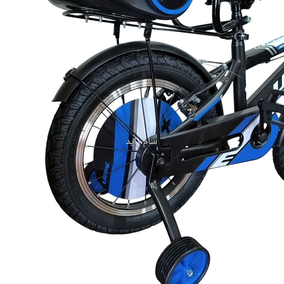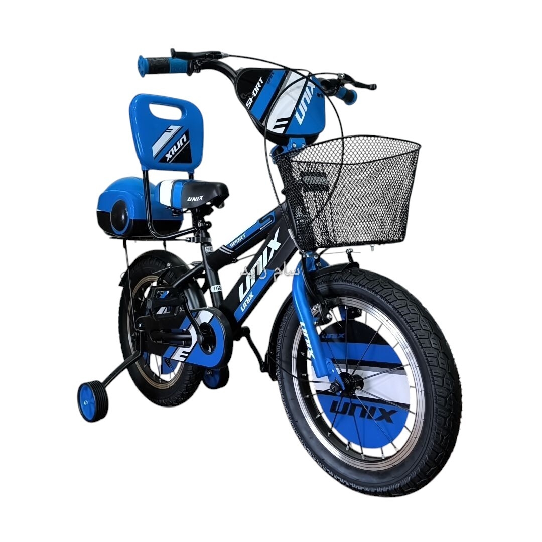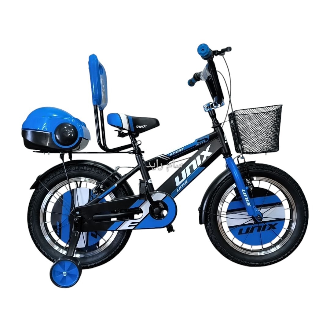 دوچرخه سایز ۱۶ مشکی آبی سبد پشتی دار لاستیک پهن UNIX