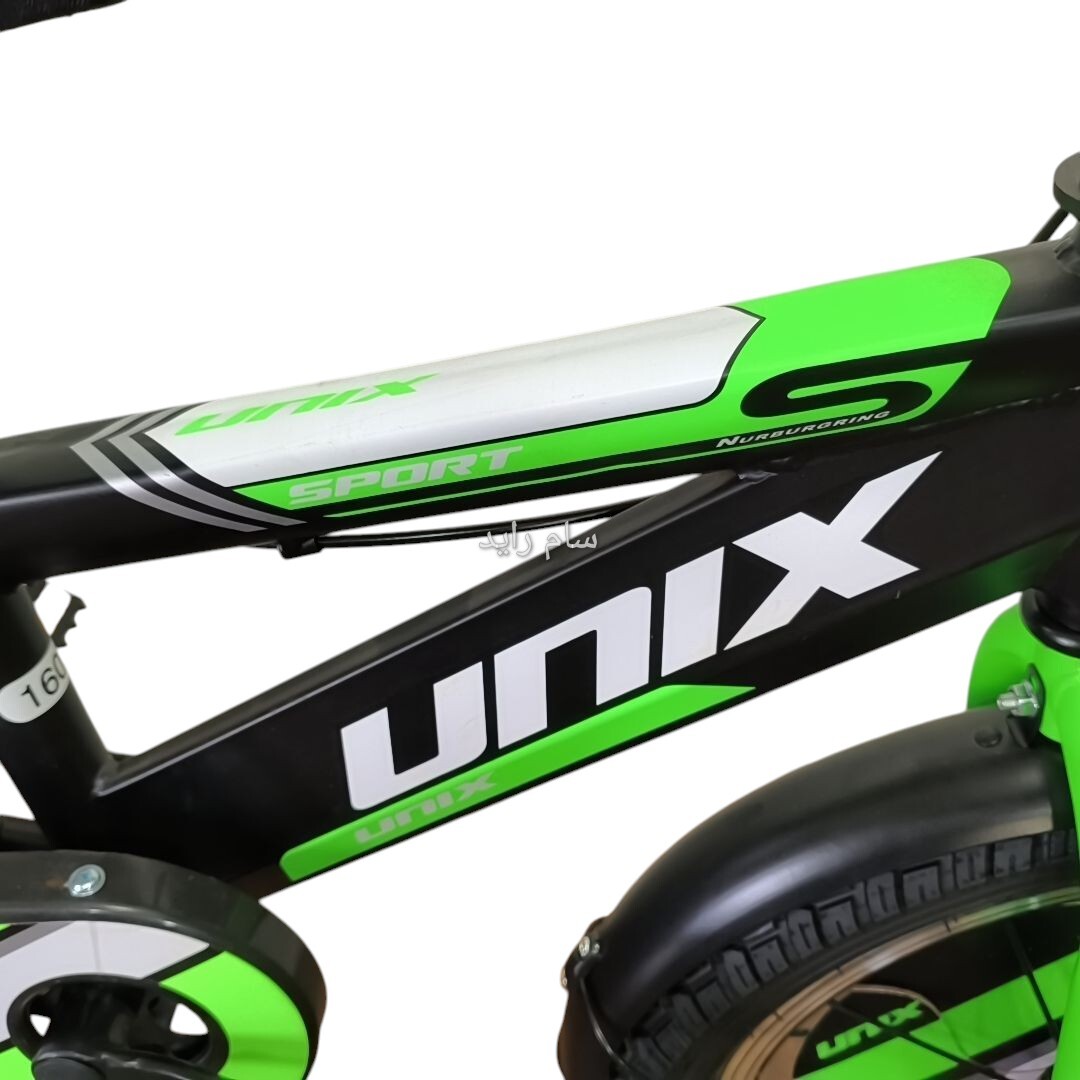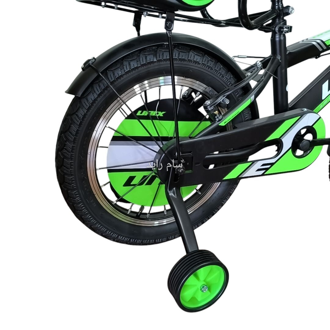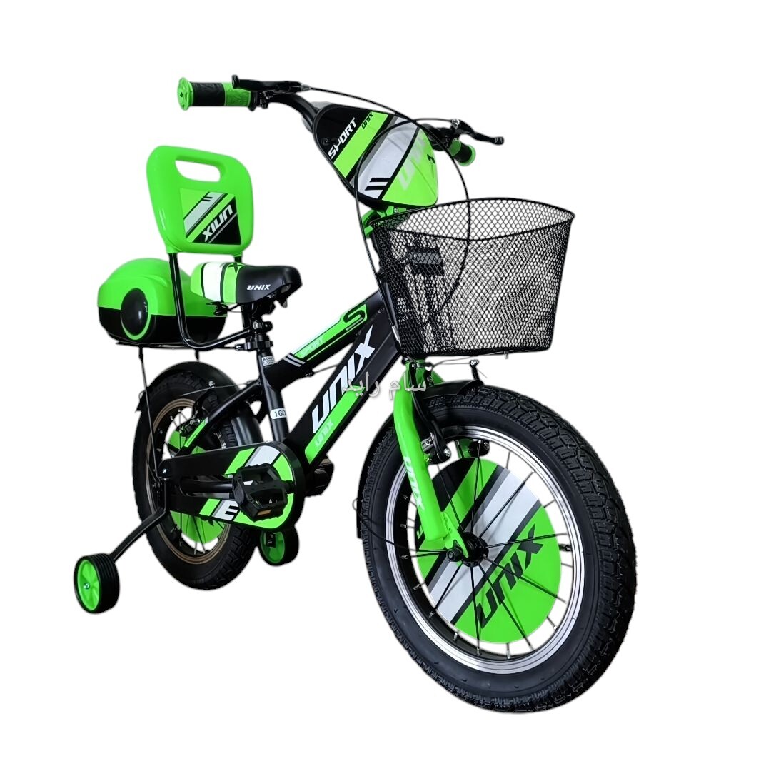 دوچرخه سایز ۱۶ مشکی سبز سبد پشتی دار لاستیک پهن UNIX